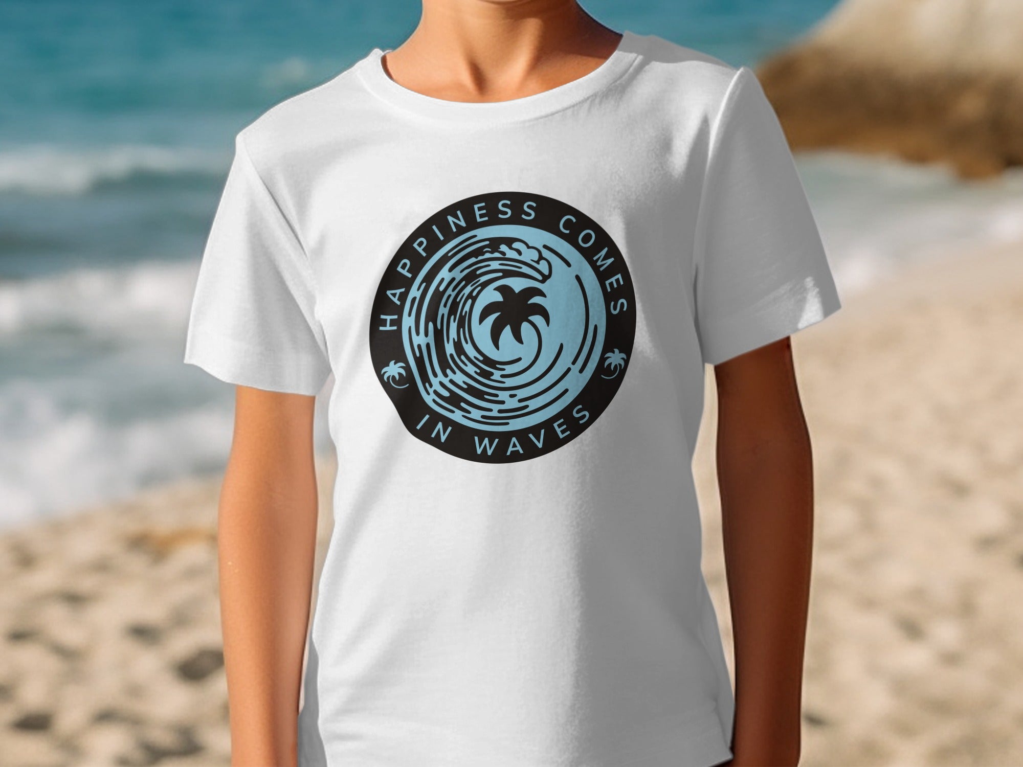 Happiness Comes In Waves Palm Tree Design Graphic T-Shirt